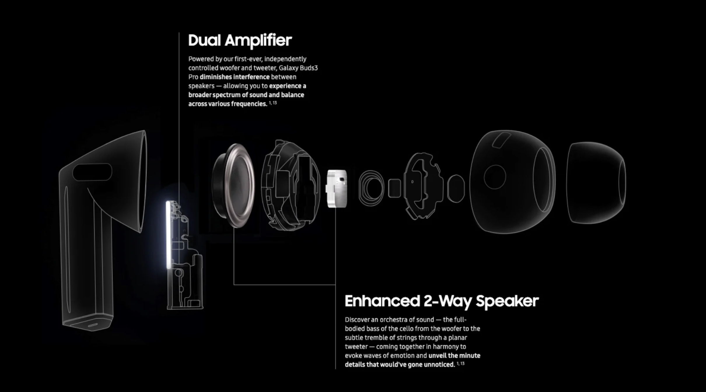 Galaxy Buds 3 Pro используют двухполосную систему: отдельный вуфер 11 мм для низких частот и твитер 6,5 мм для высоких. Такое разделение позволяет каждому драйверу работать в оптимальном диапазоне, минимизируя искажения и расширяя динамический диапазон. Поддержка 24-битного аудио с частотой дискретизации до 96 кГц через кодек Samsung Seamless Codec Pro раскрывает весь потенциал студийных записей и Hi-Res контента. Фирменная технология Scalable Codec автоматически адаптирует битрейт под качество соединения, сохраняя стабильность воспроизведения даже в условиях помех.