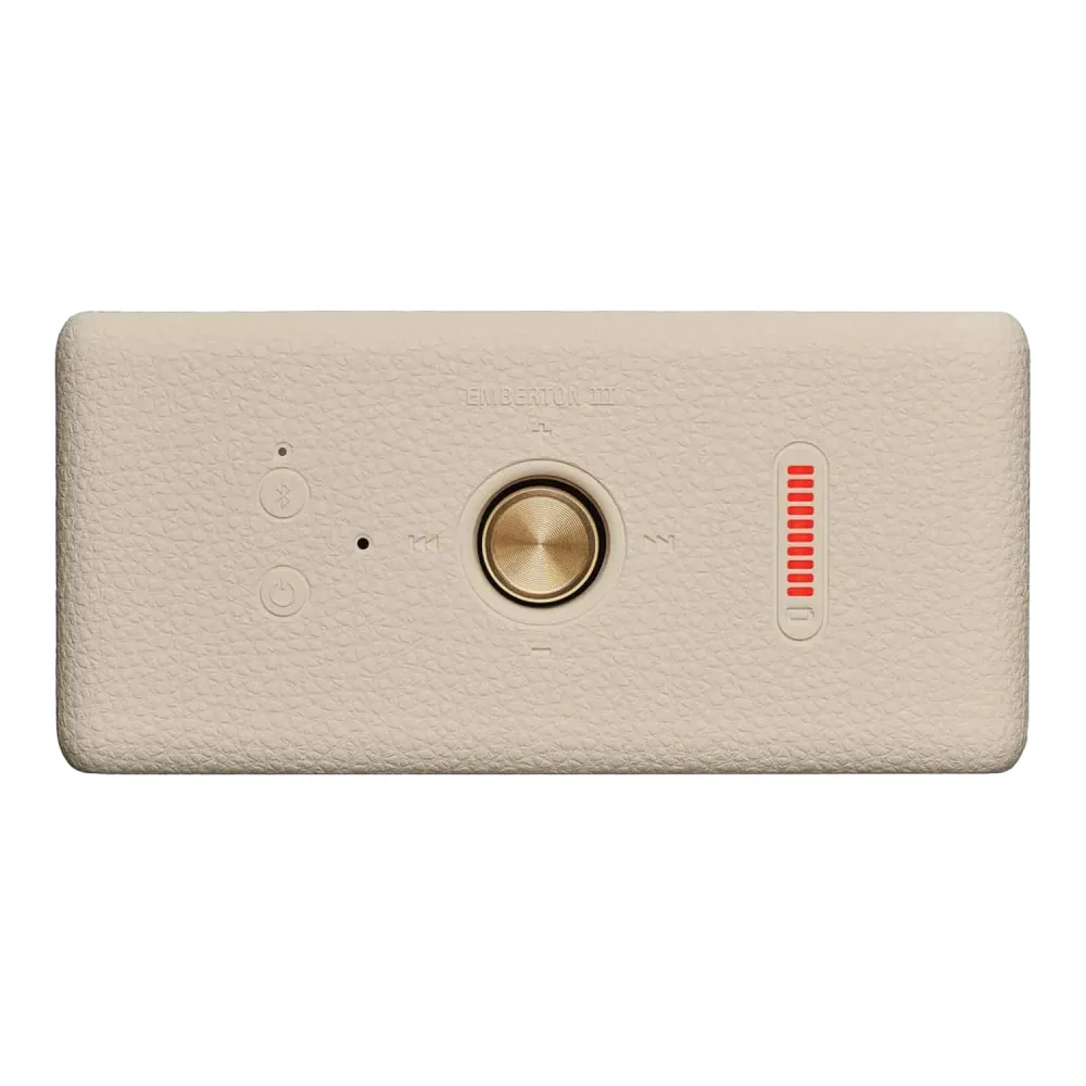 Внешний вид Emberton III остается верным традициям Marshall: фирменный скриптовый логотип, металлическая решетка и золотой многофункциональный джойстик управления.
